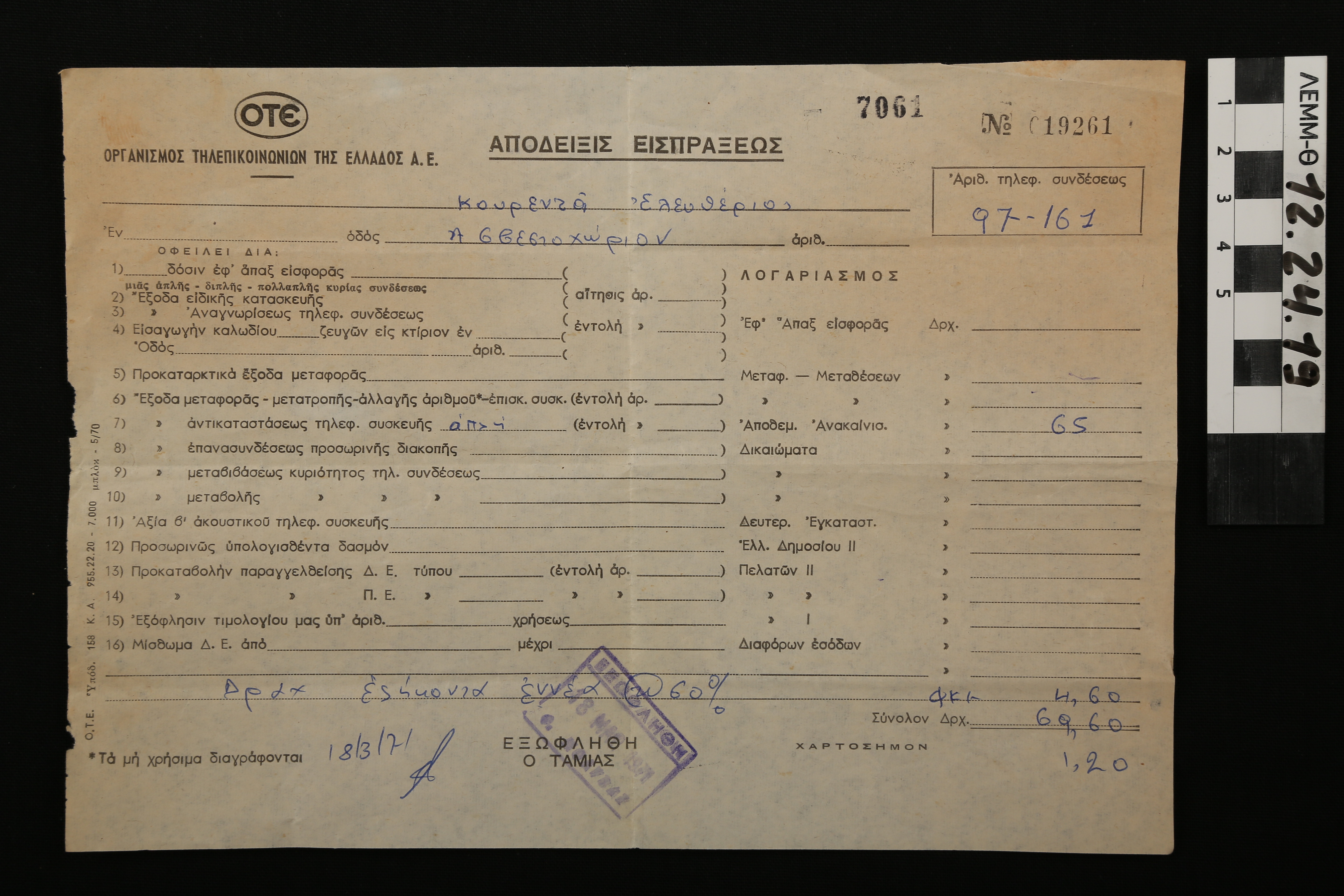 Απόδειξη - απόδειξη είσπραξης του ΟΤΕ για αντικατάσταση τηλεφωνικής συσκευής, 1971