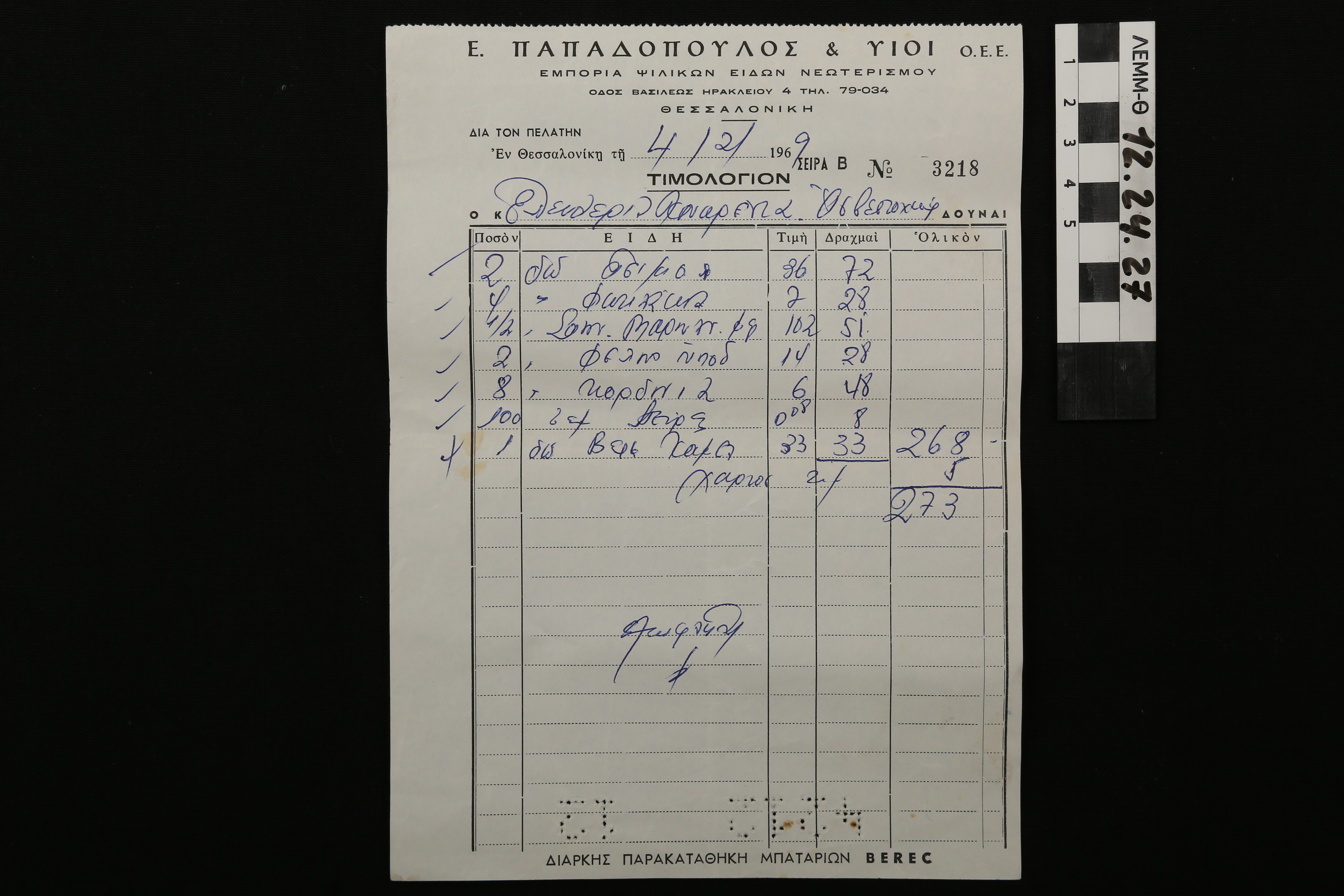 Τιμολόγιο - απόδειξη αγοράς προϊόντων από κατάστημα ψιλικών "Ε. Παπαδόπουλος &Υιοί Ο.Ε.Ε."