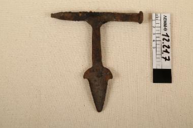 μικρό μεταλλικό εργαλείο με οριζόντια κυλινδρική λαβή σε σχήμα καρφιού και κυλινδρικό στέλεχος με λογχόσχημη απόληξη (οξυκόρυφο φτυάρι). Είναι έντονα οξειδωμένο σε όλη την επιφάνεια.