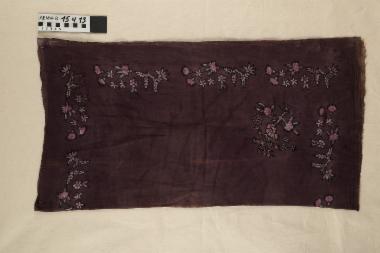 τετράγωνη μαντίλα από βαμβακερή γάζα, χρώματος μελιτζανί. Περιμετρικά στις άκρες είναι διακοσμημένη με ενυφασμένα ανθικά μοτίβα σε μωβ και πράσινο χρώμα. Είναι ξεβαμμένη σε πολλά σημεία σε ολόκληρη την επιφάνεια του υφάσματος.