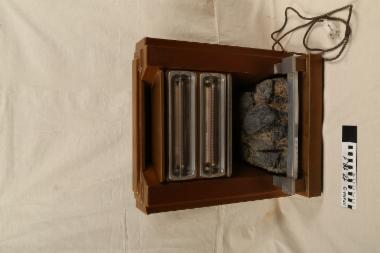 θερμάστρα δαπέδου, μεταλλική σε ορθογώνιο σχήμα, ελληνικής κατασκευής. Ο σκελετός της είναι μεταλλικός με ειδική επίστρωση και βαμμένο σε χρυσαφί χρώμα. Στην πίσω όψη υπάρχει στερεωμένο με δύο καρφιά, ένα ορθογώνιο κομμάτι αλουμινίου βαμμένο σε πράσινο χρώμα. Στο πάνω μέρος ύπάρχει και μια μικρή μεταλλική ταμπέλα, χρώματος καφέ, στην οποία αναγράφονται τα εξής, "Scarlet Electric Fire - Cat.No 50101 Serial 1171 - Watts 2000, Volts 220" και έχει το σχέδιο ενός λιονταριού με τα αρχικα ΒΗΚ. Από κάτω υπάρχει μια μικρότερη ταμπελίτσα σε μαύρο χρώμα με τις επιγραφές "Β.Η.Κ. Μοσχάτον - Ελληνική Κατασκευή". Στην μπροστινή όψη, επάνω, φέρει δύο αντιστάσεις, σε ξεχωριστές εσοχές, με σχαρες. Στην βάση υπάρχει απομίμιση καιγόμενου ξύλου, το οποίο όταν ανάβει κοκκινίζουν τα ανοιχτόχρωμα μέρη. Στο πλάι, δεξιά, φέρει δύο μικρούς πλαστικούς διακόπτες και μια οπή, από την οποία εξέρχεται το ηλεκτρικό καλώδιο, με υφασμάτινη επένδυση. (EL)