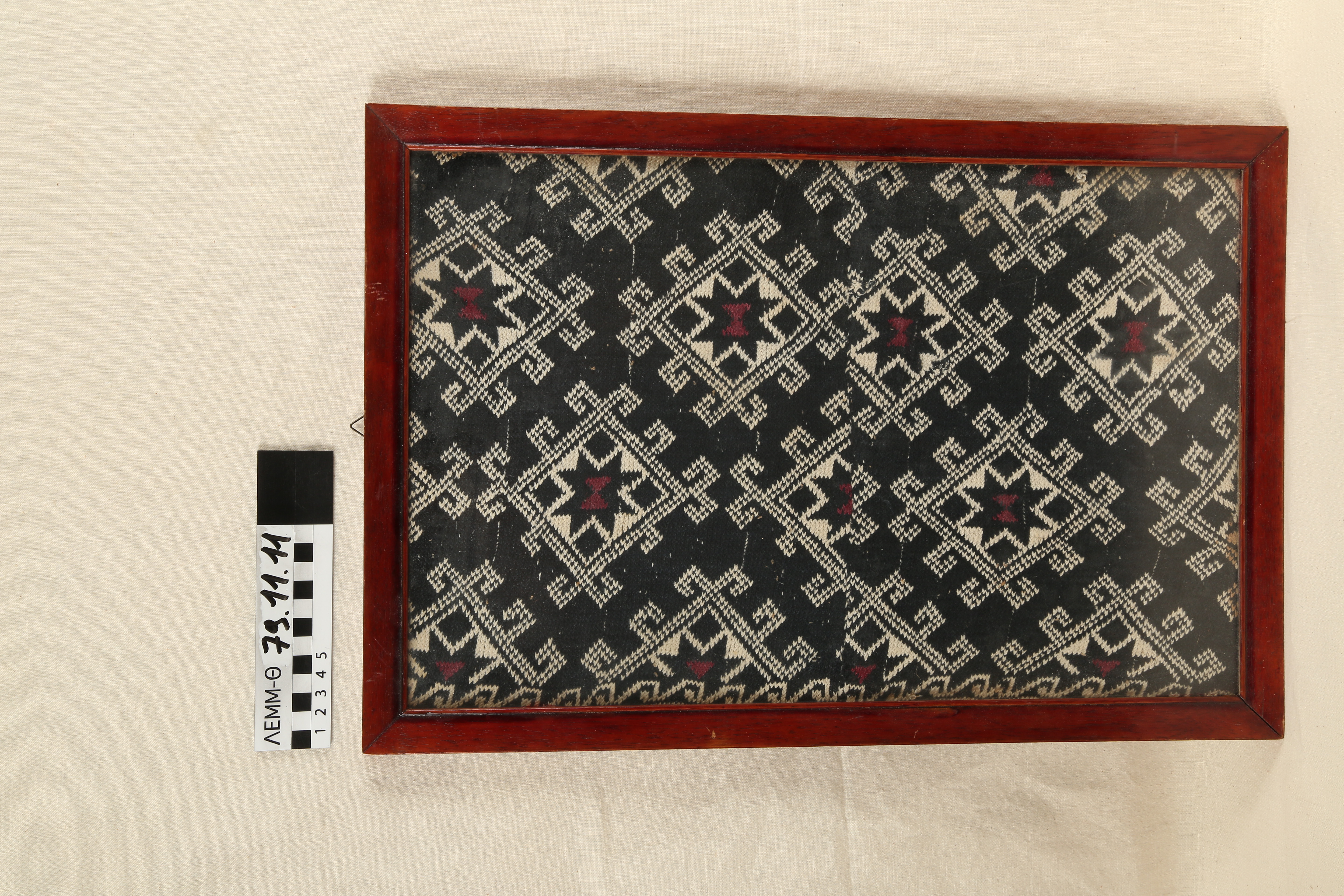 Πλεκτό σε κάδρο - μάλλινο, μαύρο πλεκτό με λευκά γεωμετρικά μοτίβα σε ξύλινο κάδρο