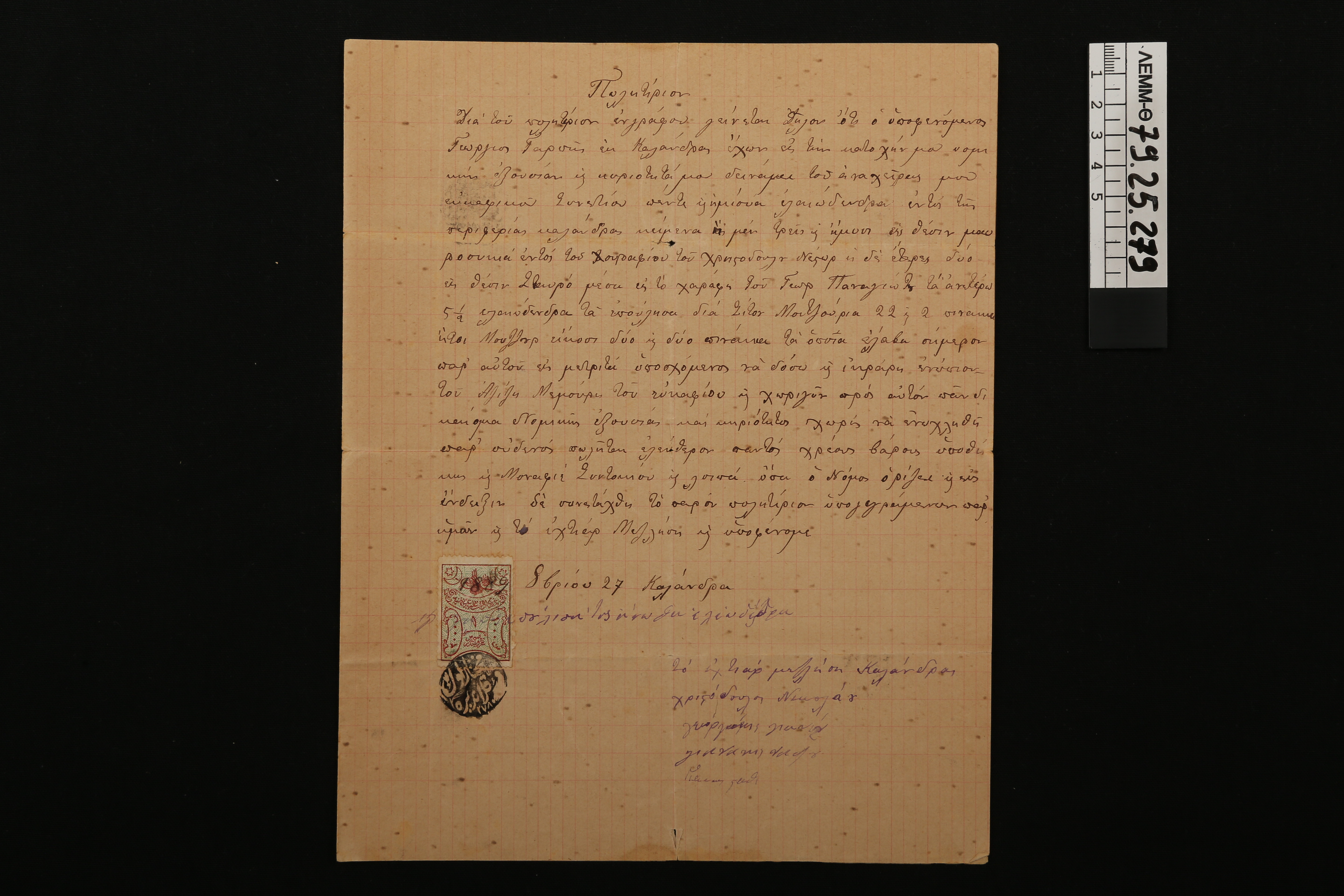 Πωλητήριο έγγραφο - έγγραφο πώλησης 5,5 ελαιόδενδρων του Γεώργιου Γαρπή, Καλάνδρα 1889