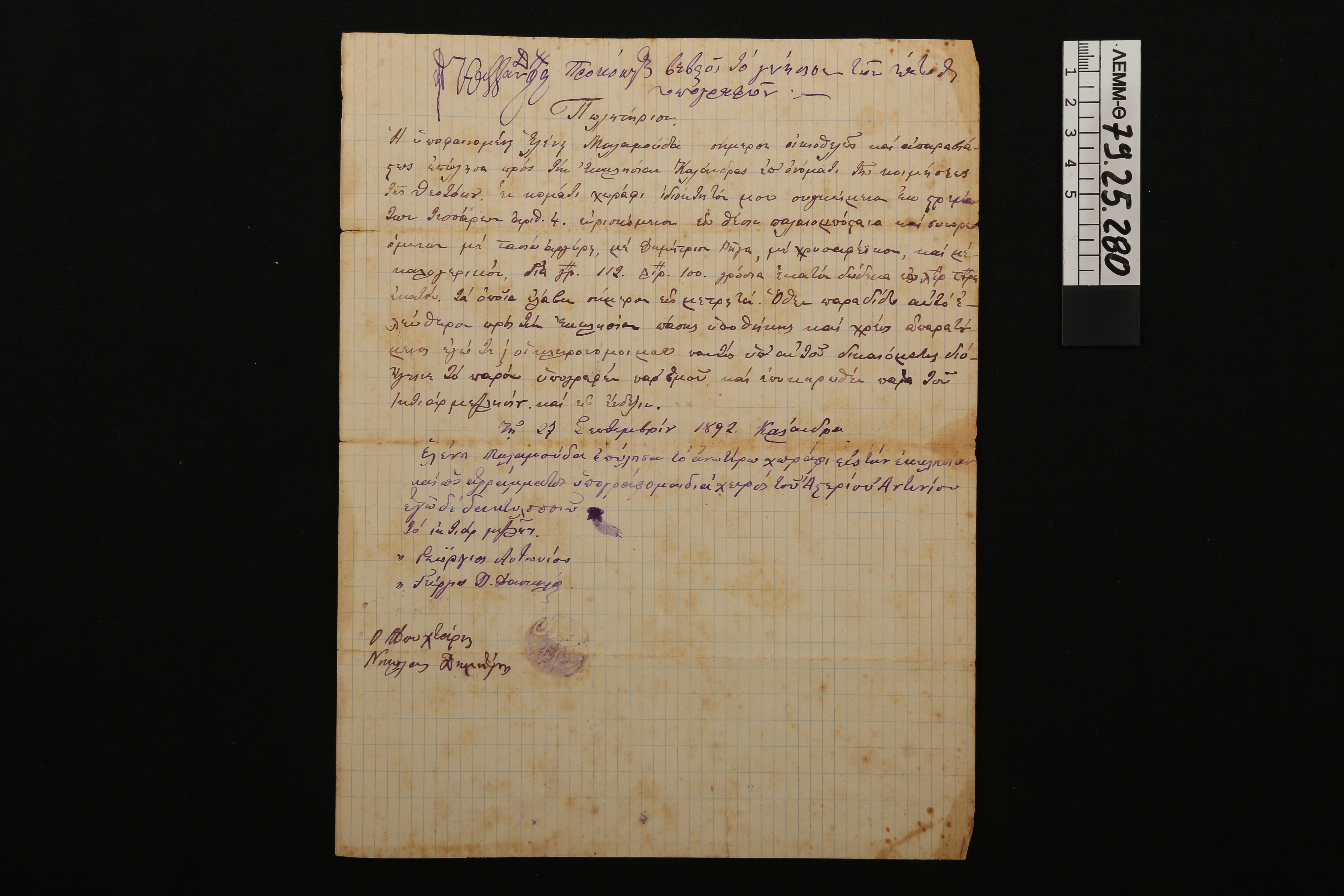 Πωλητήριο έγγραφο - χειρόγραφο πώλησης χωραφιού της Ελένης Μαμαλούδα στην εκκλησία της Καλάνδρας, 1892