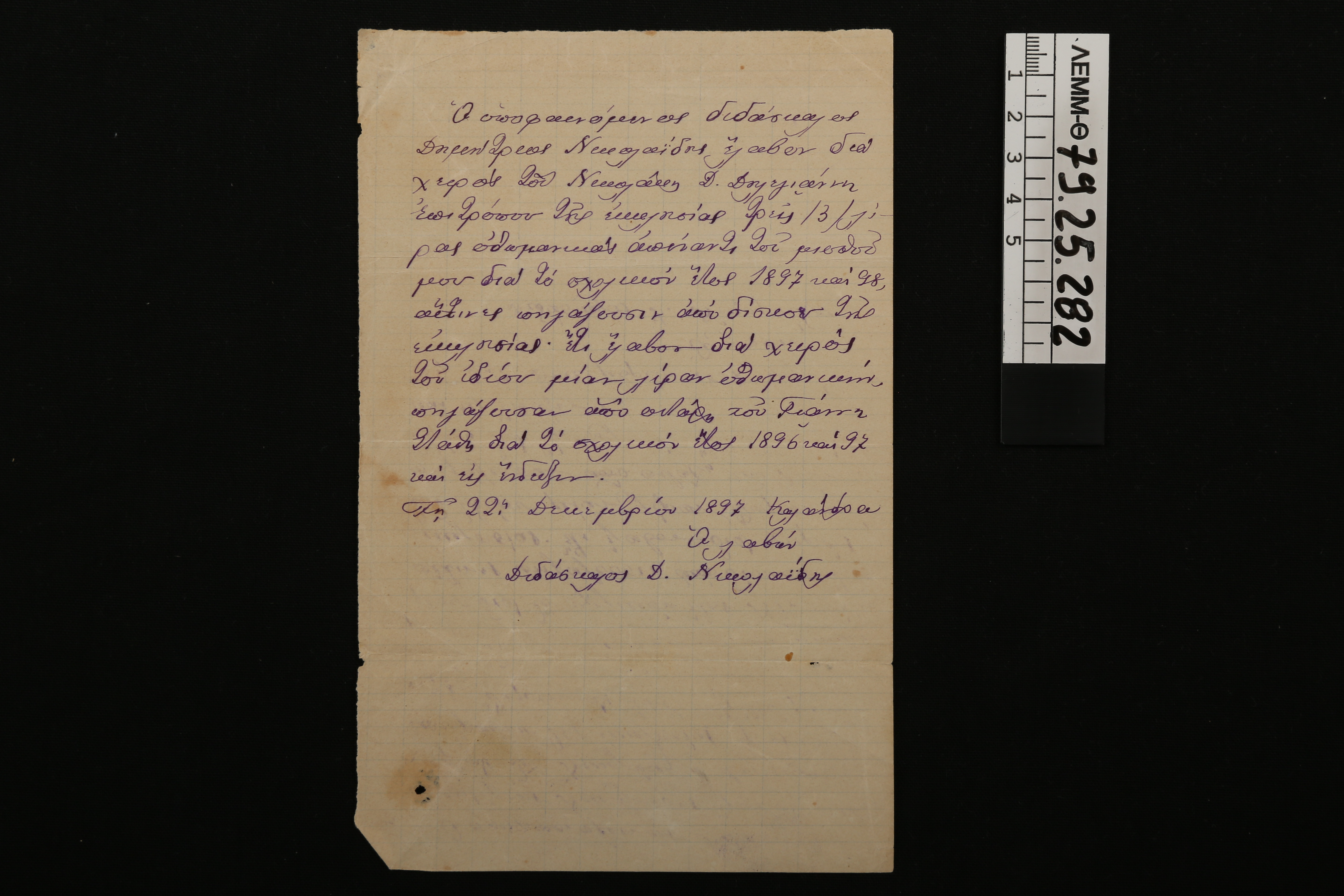 Χειρόγραφο - μονόφυλλο χειρόγραφο σύμφωνα με το οποίο ο Δημήτριος Νικολαΐδης έλαβε από τον επίτροπο της εκκλησίας Νικόλαο Δεληγιάννη 3 λίρες, έναντι του μισθού του για το σχολικό έτος 1897-98
