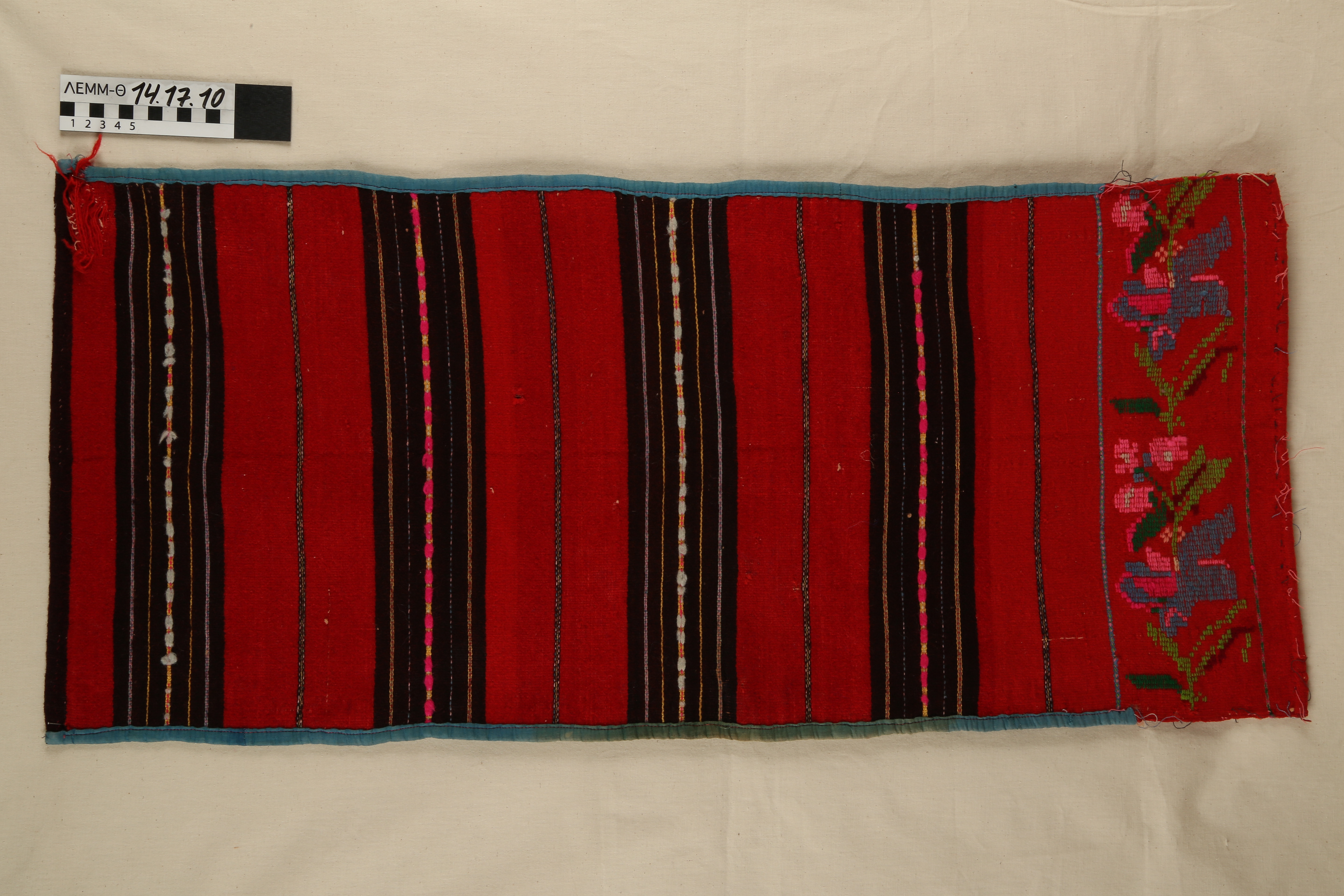 Τμήμα υφαντού - μάλλινο τμήμα φύλλου, πιθανόν από ποδιά, σε κόκκινο χρώμα διακοσμημένο με ενυφασμένες ρίγες και κεντημένα ανθικά μοτίβα