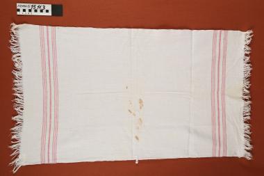 Πετσέτα - υφαντή, βαμβακερή πετσέτα, λευκή, με κόκκινες ρίγες και κρόσσια στις δύο στενές πλευρές, δεκαετίας 1930