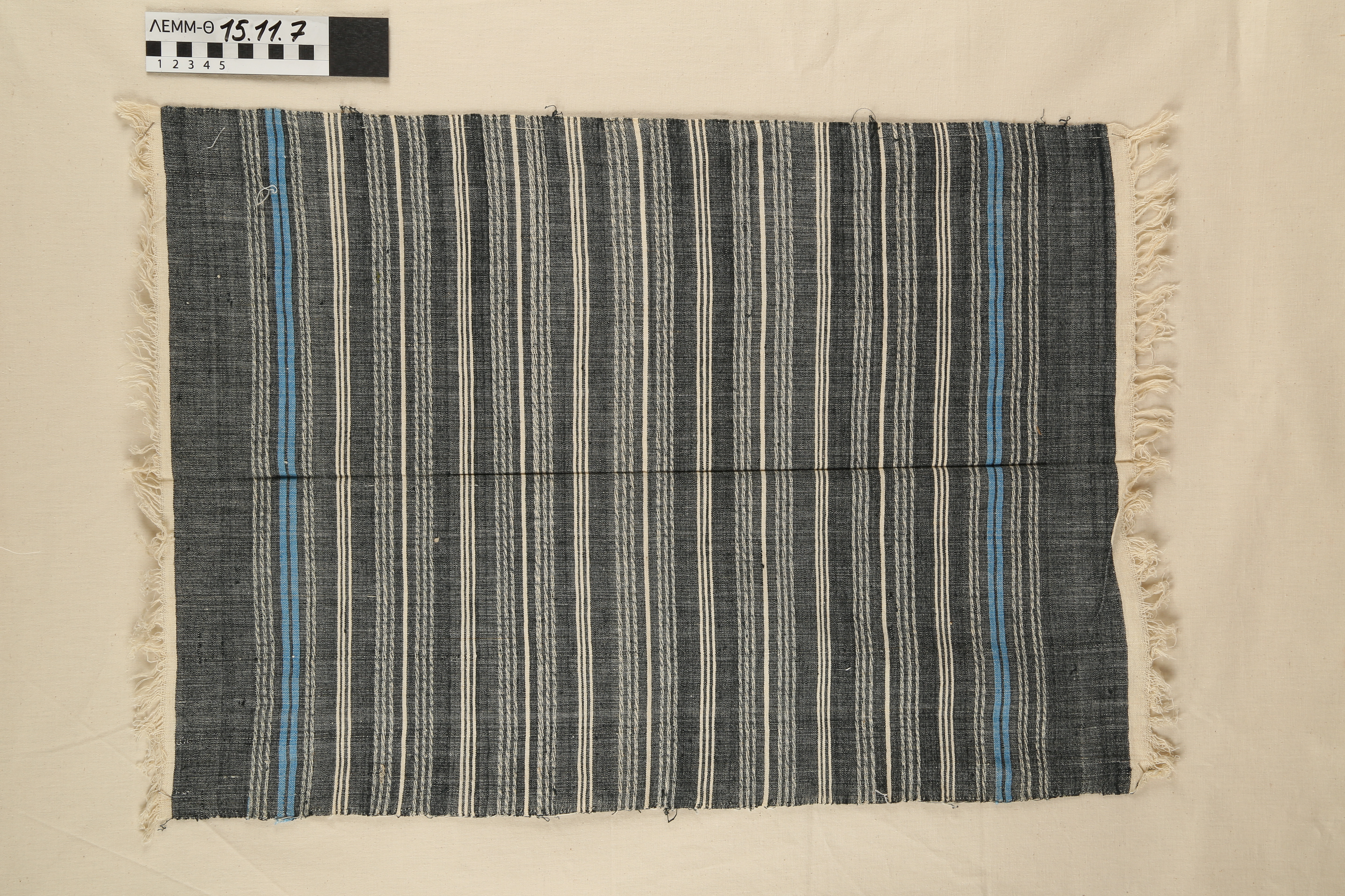 Πετσέτα - υφαντή, βαμβακερή πετσέτα σε σκούρο γκρι-μπλε χρώμα με λευκές ρίγες και στα στενά άκρα διπλή γαλάζια ρίγα και λευκά κρόσσια, δεκαετίας 1930