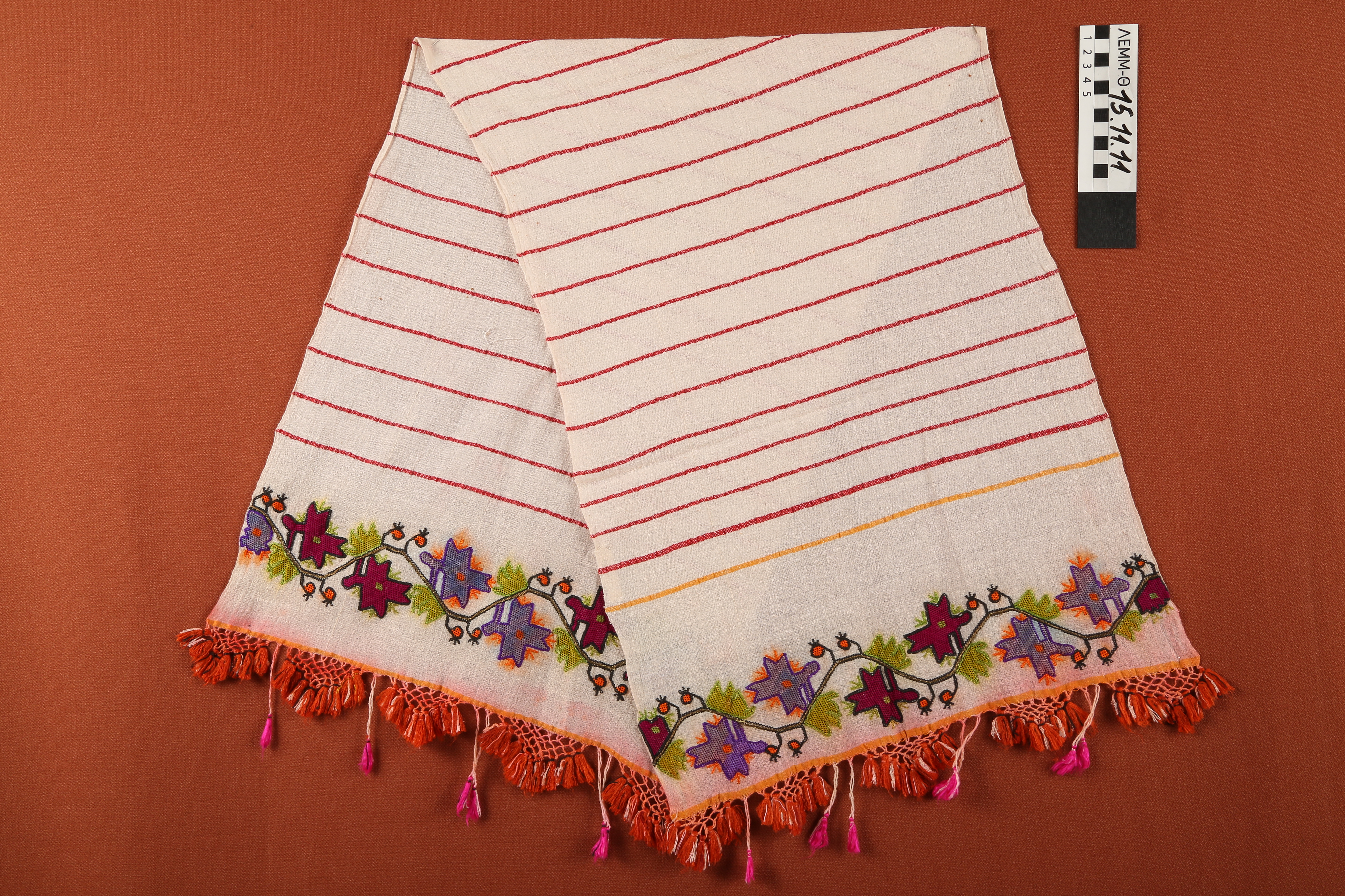 Πετσέτα - υφαντή, βαμβακερή, ριγέ πετσέτα σε μπεζ χρώμα, με κεντημένο φυτικό μοτίβο, διπλής όψεως, στις δύο στενές πλευρές. Στο τελείωμα πλεκτά κρόσσια με φούντες, δεκαετίας 1930