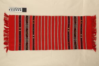 Πετσέτα - υφαντή, βαμβακερή, ριγέ πετσέτα σε κόκκινο χρώμα, κεντημένη με γεωμετρικά και τρίλοβα πολύχρωμα μοτίβα και κόκκινα κρόσσια στις στενές πλευρές, δεκαετίας 1930