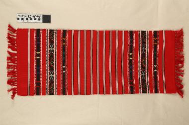 Πετσέτα - υφαντή, βαμβακερή, ριγέ πετσέτα σε κόκκινο χρώμα, κεντημένη με γεωμετρικά και τρίλοβα πολύχρωμα μοτίβα και κόκκινα κρόσσια στις στενές πλευρές, δεκαετίας 1930