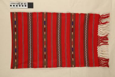 Πετσέτα - υφαντή, βαμβακερή πετσέτα σε κόκκινο χρώμα με πολύχρωμες ρίγες και πλεκτά κρόσσια στις στενές πλευρές, δεκαετίας 1930