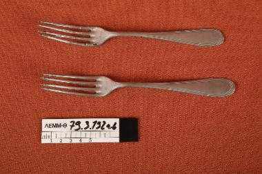 δύο όμοια πιρούνια, επαργυρωμένα με τέσσερα δόντια. Πεπλατυσμένη λαβή με εγάρακτες γραμμές (τρεις) περιμετρικά και στην πίσω όψη φέρουν εγχάρακτο σχέδιο, ένα τετράφυλλο και την επιγραφή "DUREX". Φέρουν φθορές.