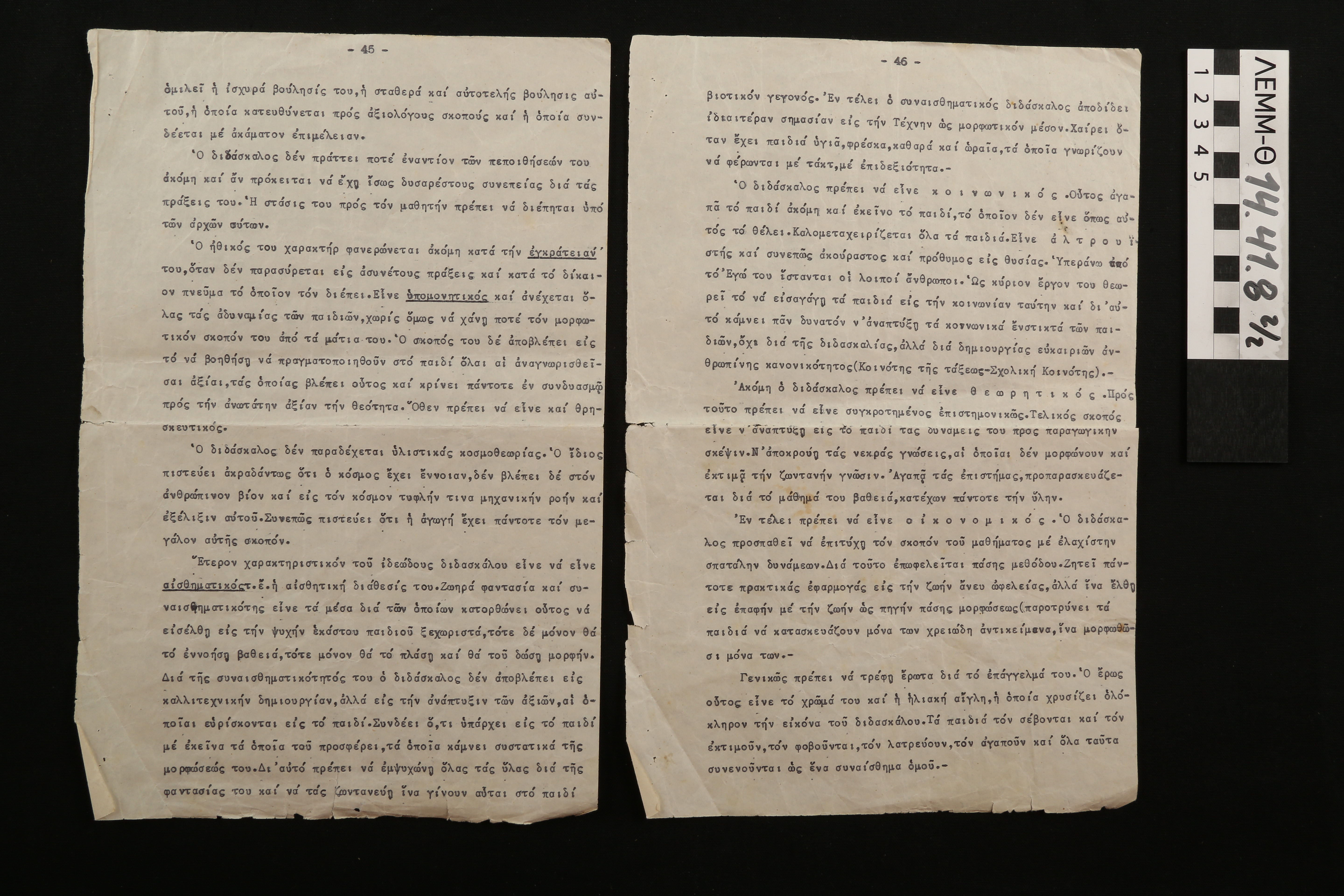 Φύλλο σημειώσεων - δύο δακτυλογραφημένες σελίδες σημειώσεων του Ε. Σάκκη, σελ. -45- και-46-, σχετικά με τα χαρακτηριστικά του "ιδεώδους δασκάλου"
