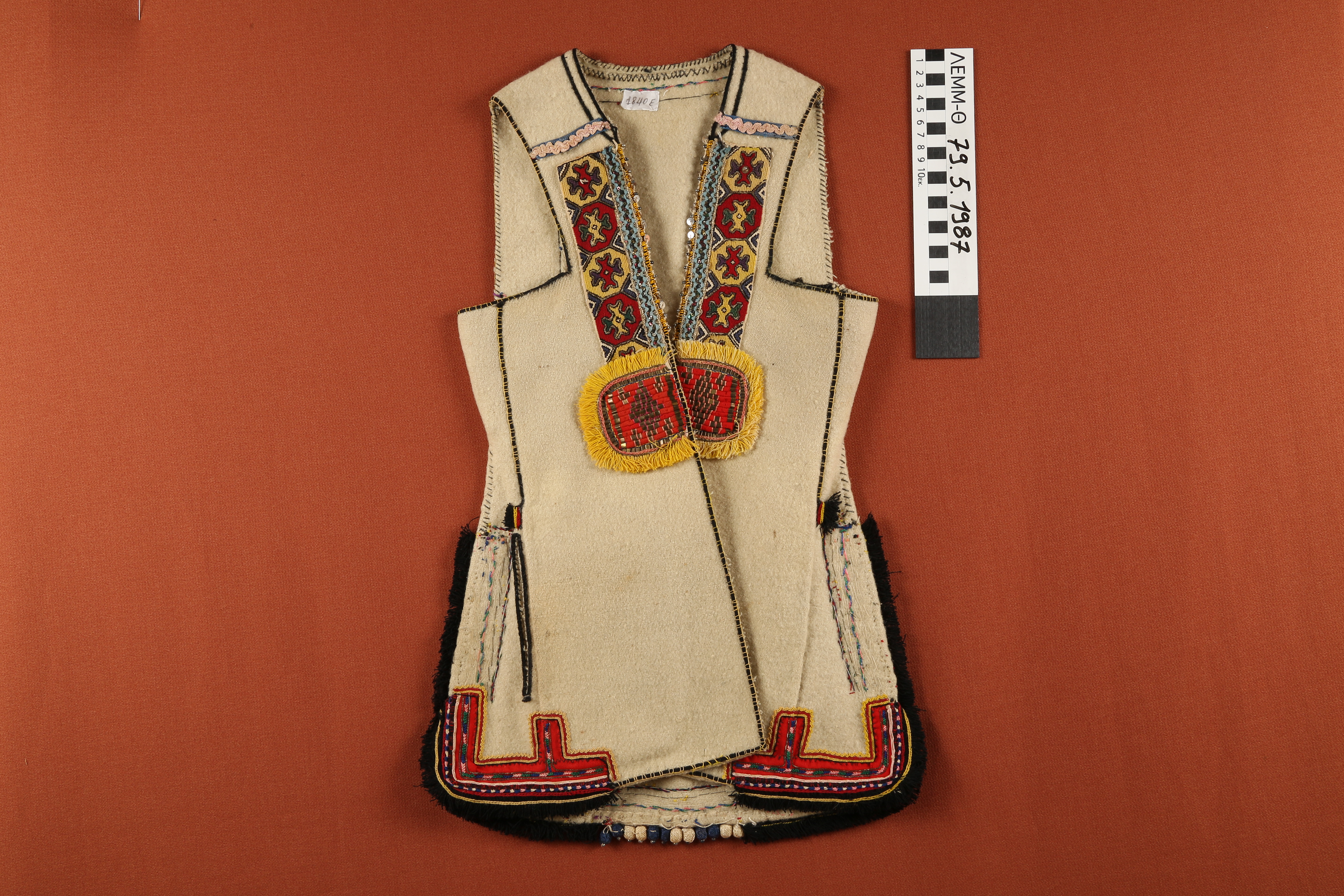 Επενδύτης - μάλλινος, αμάνικος, παιδικός σαγιάς, σε υπόλευκο χρώμα διακοσμημένο με κεντημένες υφαντές κορδέλες με σταυρόσχημα μοτίβα και μαύρα κρόσσια