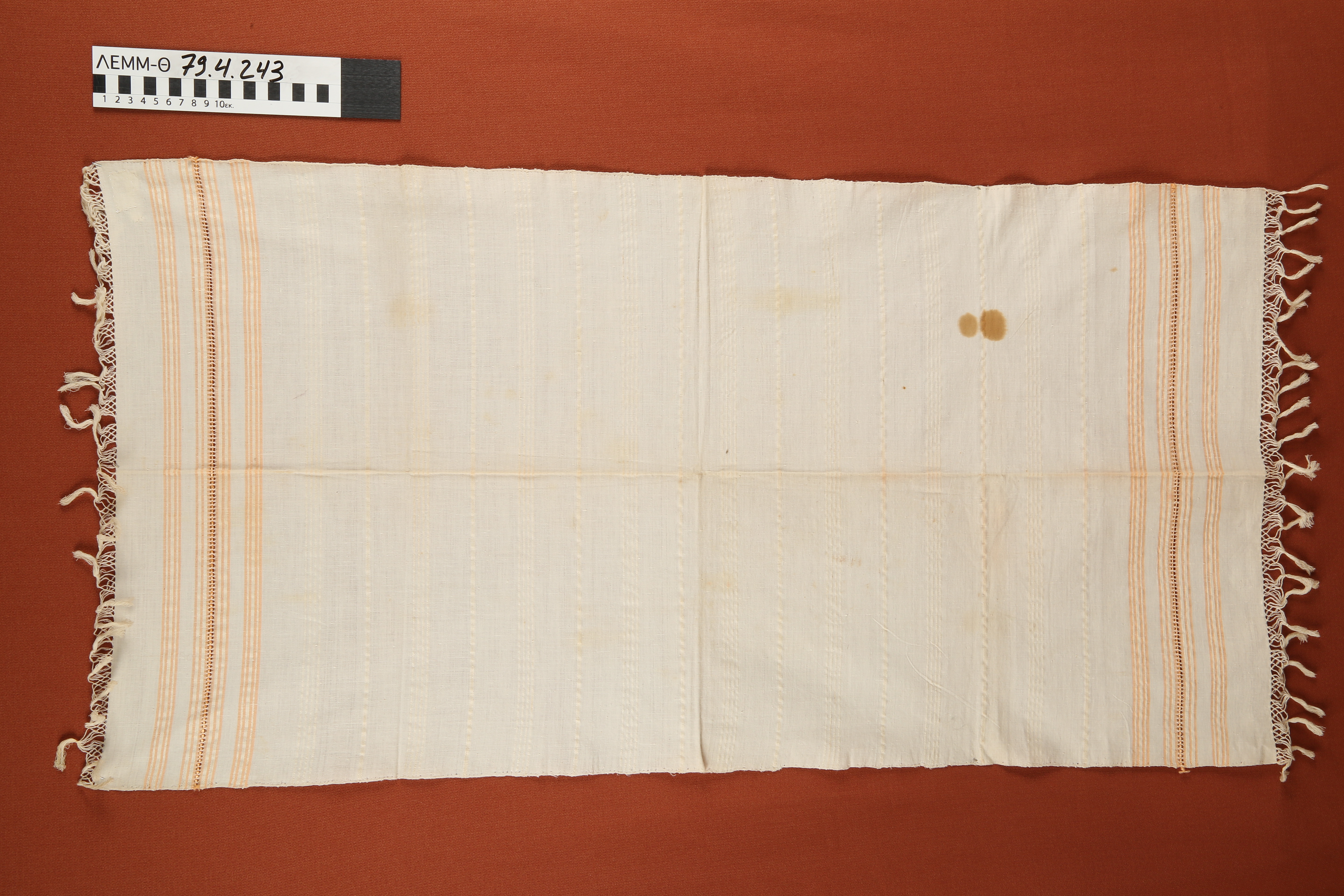 Τσεβρές - υπόλευκος, υφαντός τσεβρές με ενυφασμένες, μεταξωτές σομόν ρίγες και πλεκτά κρόσσια στις στενές πλευρές