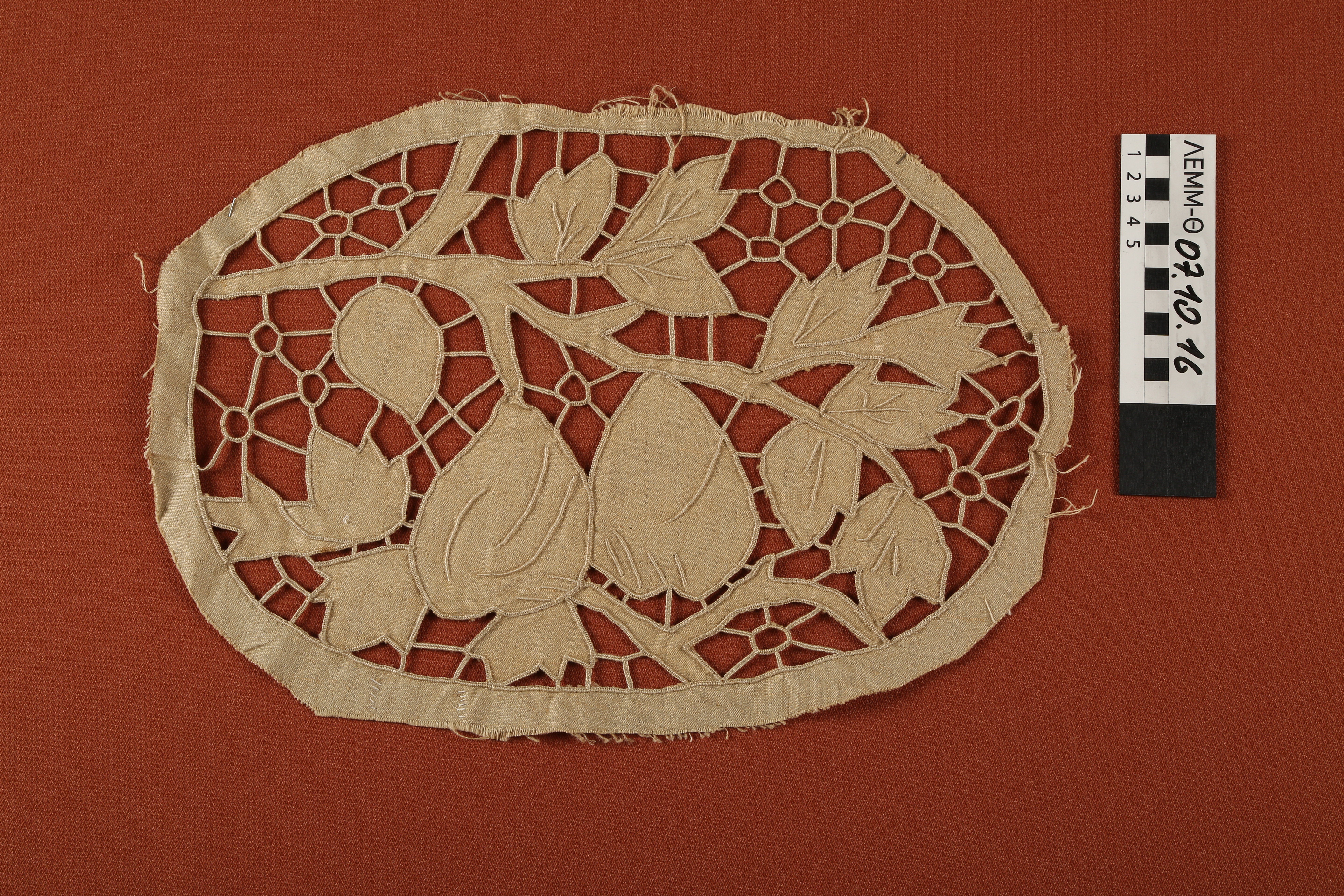 Πετσετάκι - οβάλ, κοφτό πετσετάκι σε σκούρο μπεζ χρώμα, με ανθικό μοτίβο