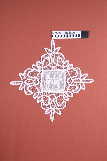 Πετσετάκι - λευκό, ρομβοειδές, δαντελένιο πετσετάκι με δύο γυναικείες φιγούρες στο κέντρο