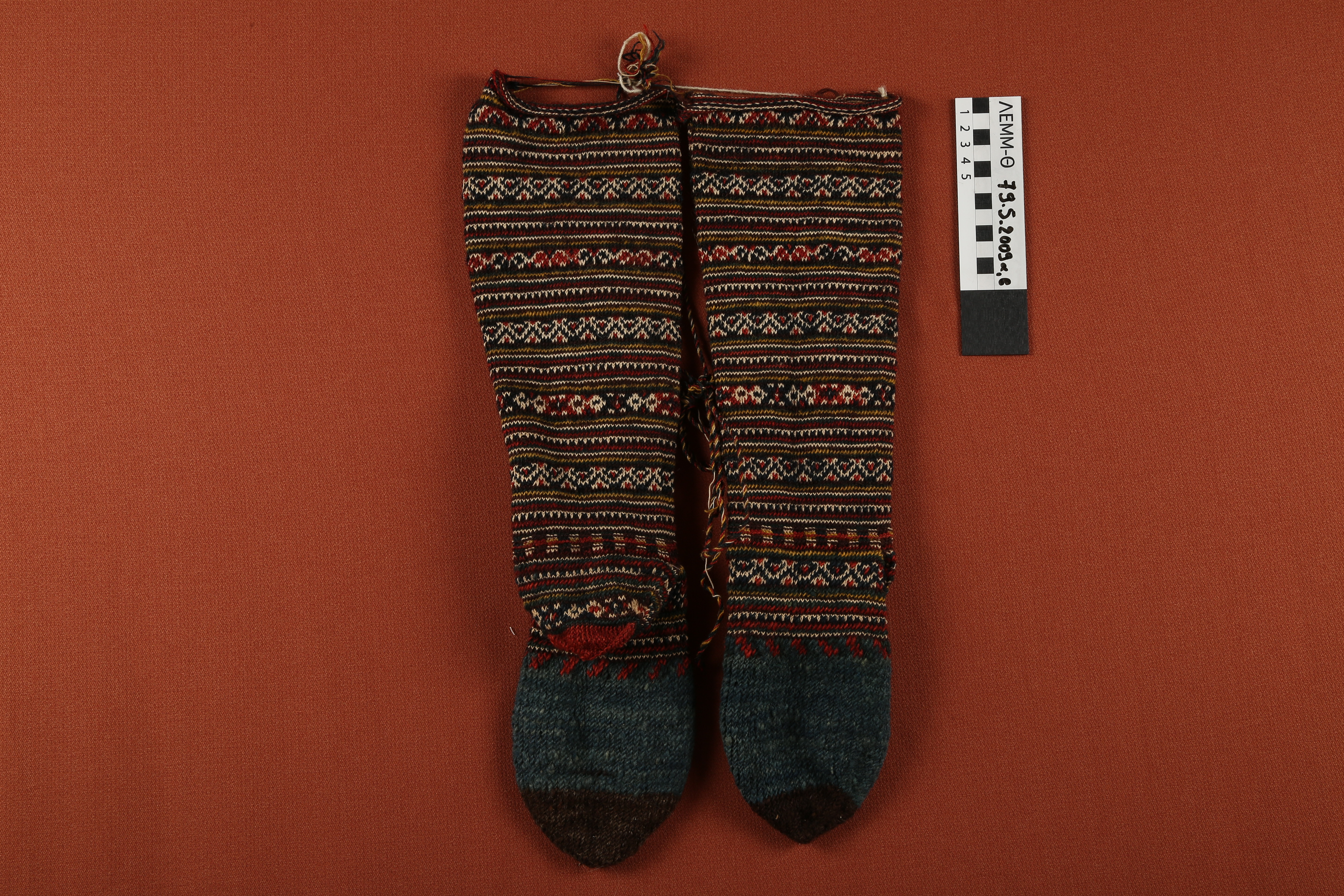 Κάλτσες - μακριές, μάλλινες κάλτσες με ρίγες σε μαύρο, κεραμιδί, καφέ, μπλε και λευκό χρώμα
