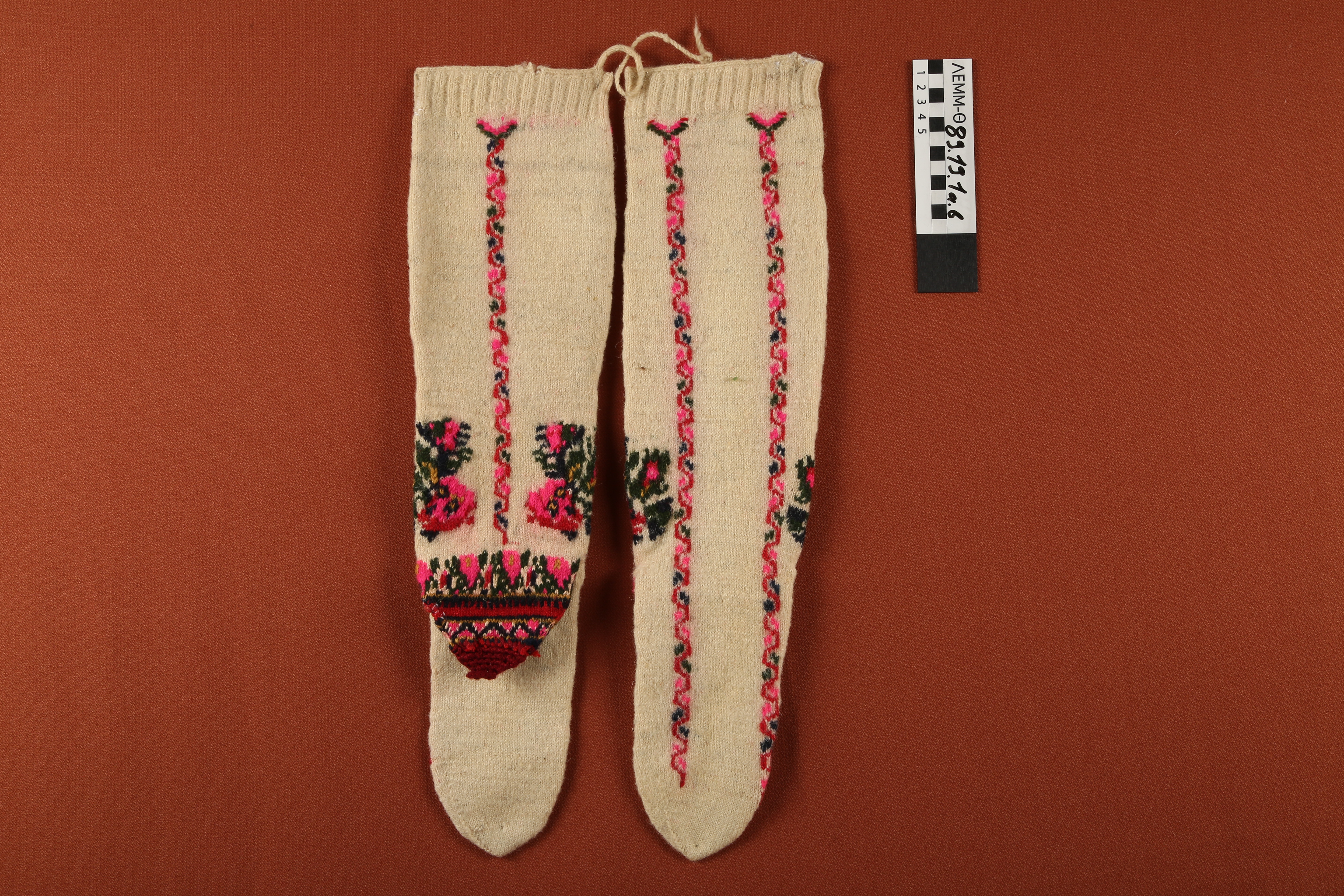 Κάλτσες - μακριές, μάλλινες, υπόλευκες κάλτσες μεανθικό κέντημα σε φουξ, πράσινο και μπλε χρώμα