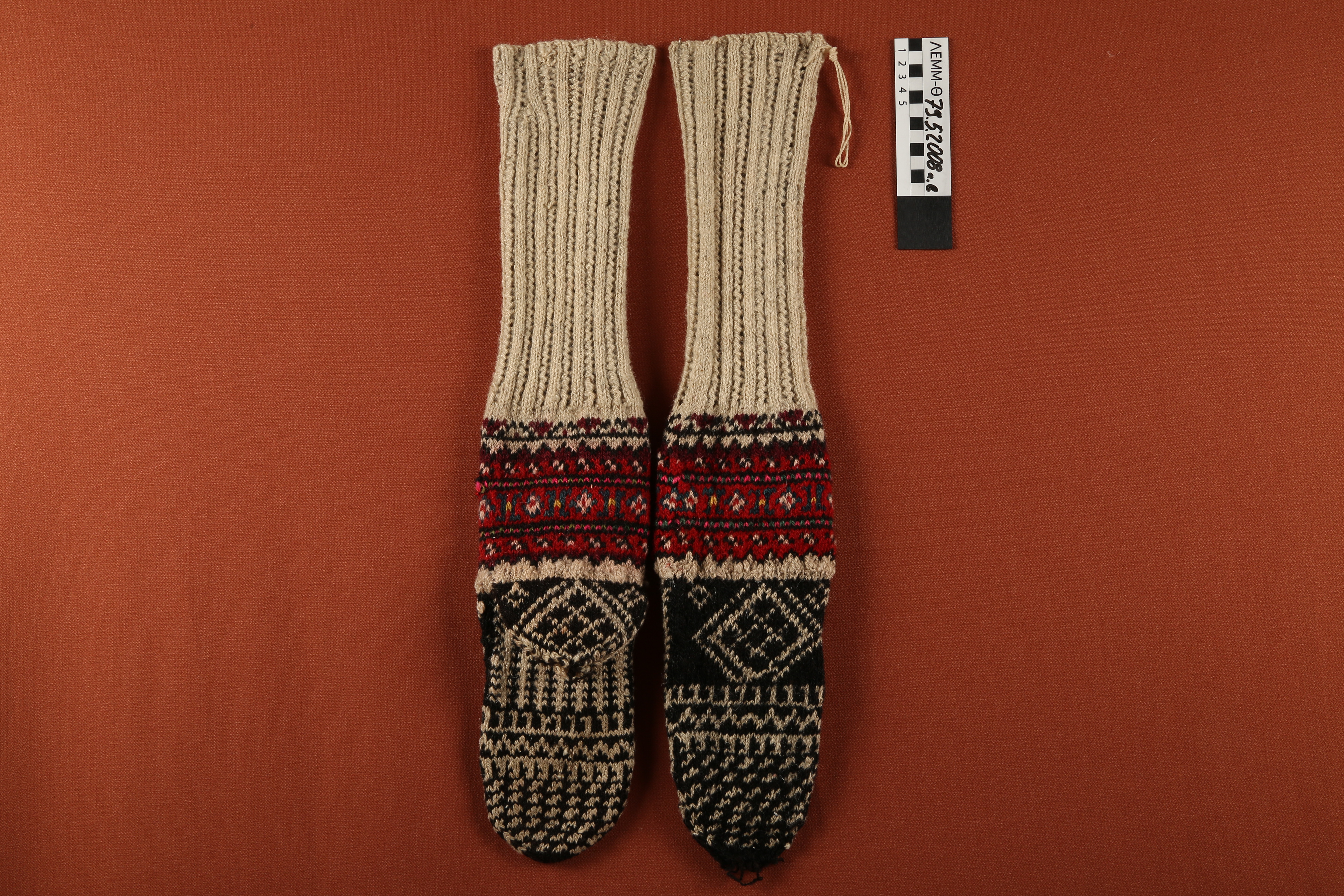 Κάλτσες - ζεύγος, μάλλινες, υπόλευκες κάλτσες με με ανθικά και γεωμετρικά μοτίβα σε κόκκινο και μαύρο χρώμα
