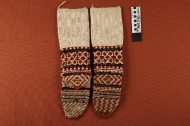 ψηλές, μάλλινες κάλτσες, πλεκτές με βελόνα πλεξίματος. Αποτελείται από ενιαίο φύλλο. Στον κορμό, στο ύψος του αστραγάλου, φαρδιά ταινία στην πλέξη σε κεραμιδί, μαύρο, πράσινο και πορτοκαλί χρώμα με γεωμετρικά μοτίβα. Οι πατούσες είναι υπόλευκες με καφέ και μαύρες, οριζόντιες και κατακόρυφες ταινίες από γεωμετρικά μοτίβα. Στο πάνω μέρος του ποδιού (κου ντε πιε) έχει στην πλέξη ρομβόσχημο μοτίβο με καφέ αγκύλες και στο κάτω μέρος της πατούσας σειρές από τεθλασμένες μαύρες και καφέ γραμμές σε οριζόντια διάταξη και διαγώνιες καφέ ρίγες.