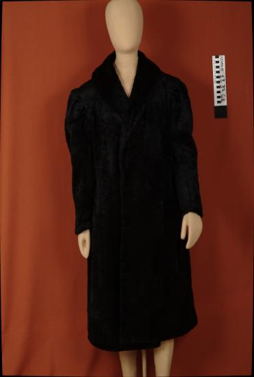 παλτό γυναικείο, λούτρινο ,μαύρο μακρύ .Φέρει μονοκόμματα πέτα και στενά μανίκια Εσωτερικά είναι επενδεδυμένο με μαύρη φόδρα και φέρει εσωτερική τσέπη με μικρές πιέτες στο πάνω τμήμα της .Κλείνει με μεταλλικές κόπιτσες . Κάτω από τη φόδρα η γούνα είναι επενδεδυμένη με βαμβακερό ύφασμα σε καφέ απόχρωση .Το κάτω μέρος της φόδρας είναι ξηλωμένο