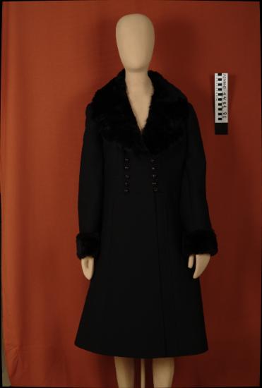 γυναικείο,μάλλινο ,μαύρο .Φέρει φαρδύ πέτο γιακά από μαύρο λούτρ ,και όμοιες μανσέτες στα μανίκια .Στο κατακόρυφο άνοιγμα φέρει διακοσμητικά μαύρα εξώραφα γαζιά ,και δύο σειρές στρόγγυλα μαύρα κουμπιά, που ασφαλίζουν με θηλιές .Στη μέση δημιουργείται διακοσμητική ζώνη που στο ύψος της πλάτης φέρει κουμπί .Κάτω από τη μέση εκατέρωθεν παρατηρούνται δύο εσωτερικές τσέπες .Το παλτό φέρει εσωτερική επένδυση από μαύρη γυαλιστερή φόδρα .<br />