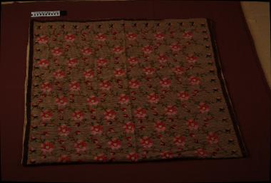 χαλί βαμβακερό, μπεζ- καφέ ,κεντημένο εξ ολοκλήρου με σταυροβελονιά και επαναλαμβανόμενο μοτίβο με λουλούδι ροζ- φούξια και κλαδί με φύλλα και μπουμπούκια. Περιμετρικά φέρει κεντημένη λωρίδα πλάτους 3εκ σε σκούρο καφέ χρώμα.Η πίσω πλευρά είναι επενδεδυμένη με βαμβακερό ύφασμα σε μπεζ χρώμα.Παρουσιάζει φθορές στην κεντημένη επιφάνεια.<br />