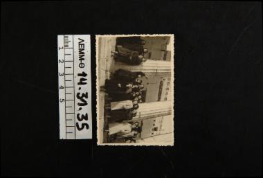 Ασπρόμαυρη φωτογραφία που απεικονίζει ομάδα κοριτσιών κατά τη διάρκεια επίσκεψής τους στην Ακρόπολη Αθηνών.Σε πρώτο πλάνο διακρίνονται δύο μεγάλοι κίονες .Τα κορίτσια βρίσκονται κατά ομάδες στις πέτρινες σκάλες .Διακρίνεται μία γυναίκα συνοδός με σηκωμένο χέρι που ίσως κάνει την ξενάγηση.