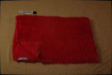 μάλλινη ,υφαντή ,μονοκόμματη, σε κόκκινο χρώμα . Παρουσιάζει ελαφρύ ξεθώριασμα  το χρώμα, και σε ορισμένα σημεία έχουν μειωθεί τα φλόκια της βελέντζας από τη χρήση <br /> (EL)