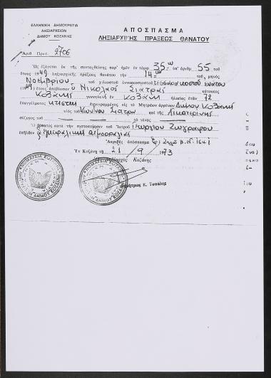 Ληξιαρχική πράξη θανάτου, Κοζάνη 1973.