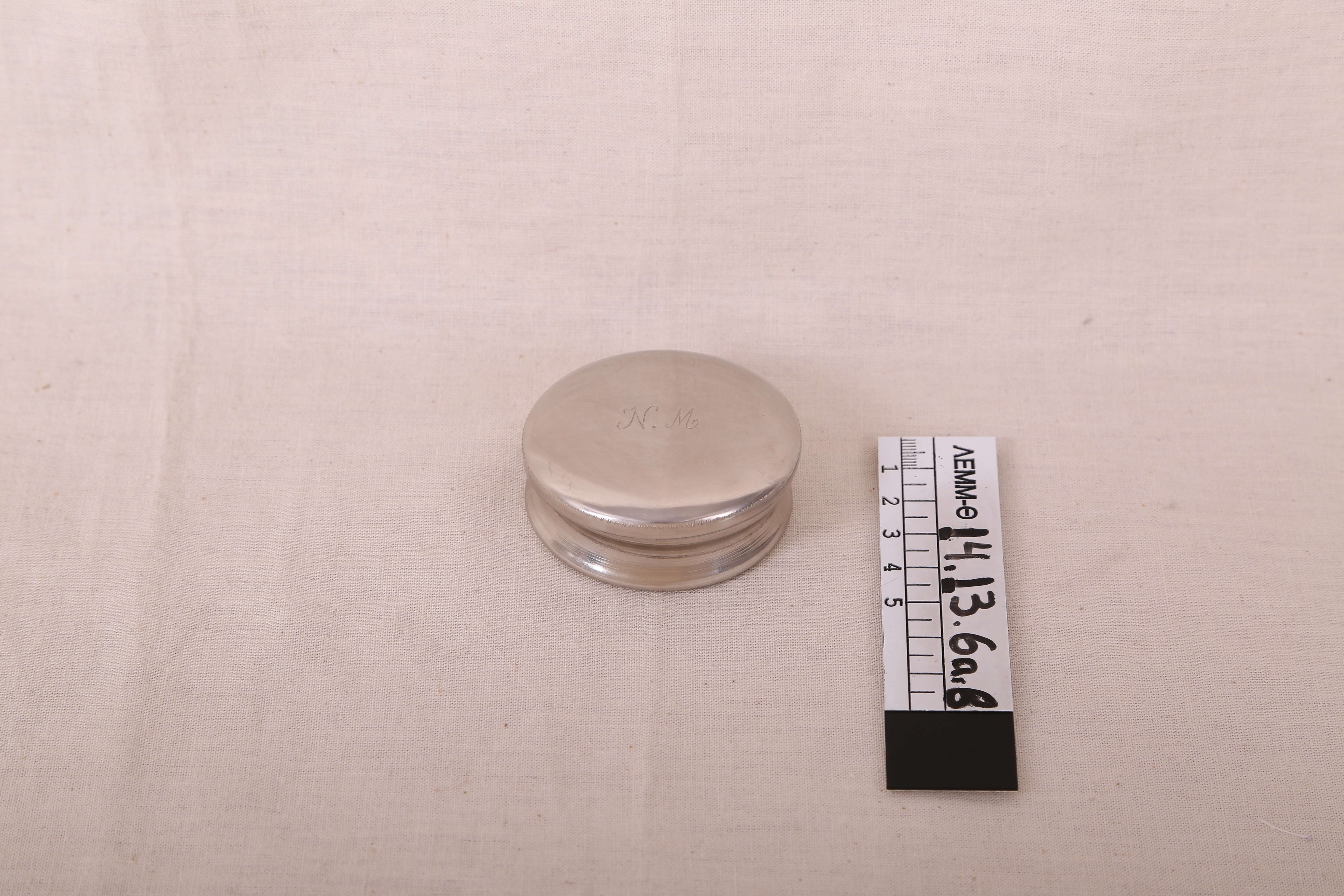 Θήκη - θήκη μεταλλική στρογγυλή, που αποτελείται από βάση και καπάκι, με εγχάρακτα αρχικά "Ν.Μ." στην εξωτερική επιφάνεια του καπαπιού. Χρησιμοποιήθηκε ως μπονμπονιέρα