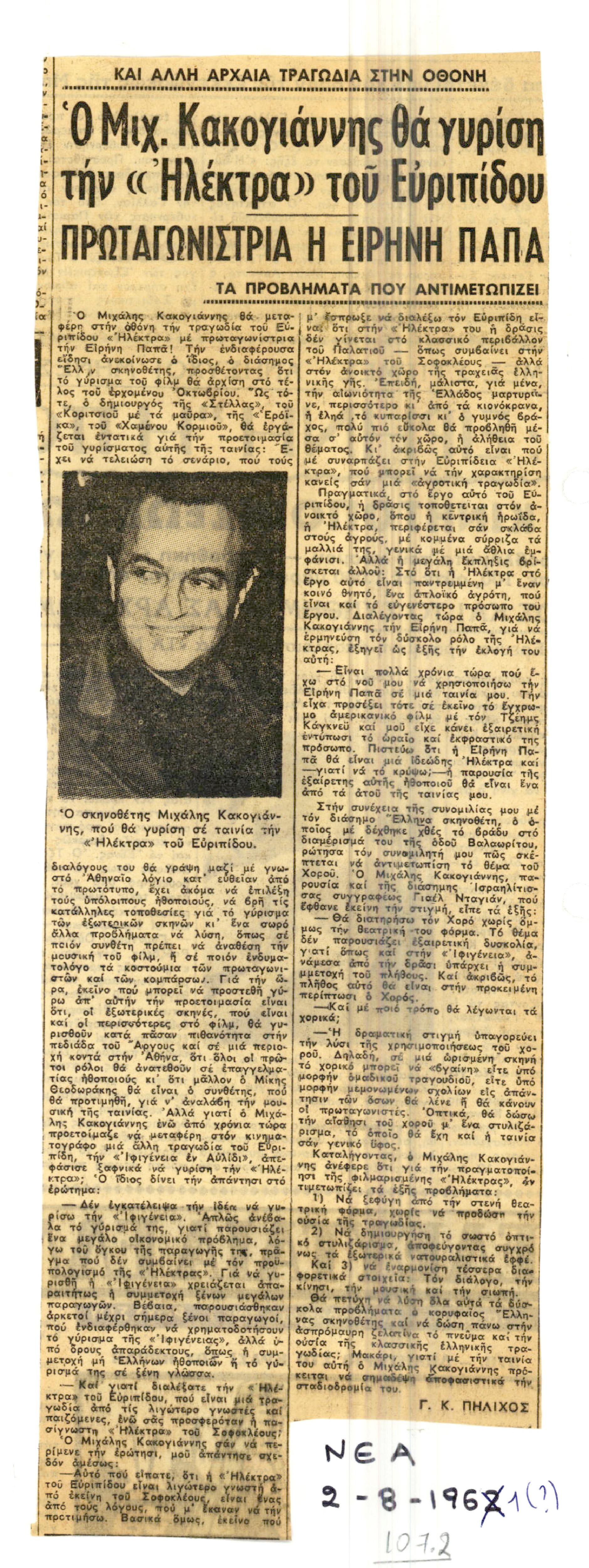 Και άλλη αρχαία τραγωδία στην οθόνη, Ο Μιχ. Κακογιάννης θα γυρίση την «Ηλέκτρα» του Ευρυπίδου, Πρωταγωνίστρια η Ειρήνη Παπά