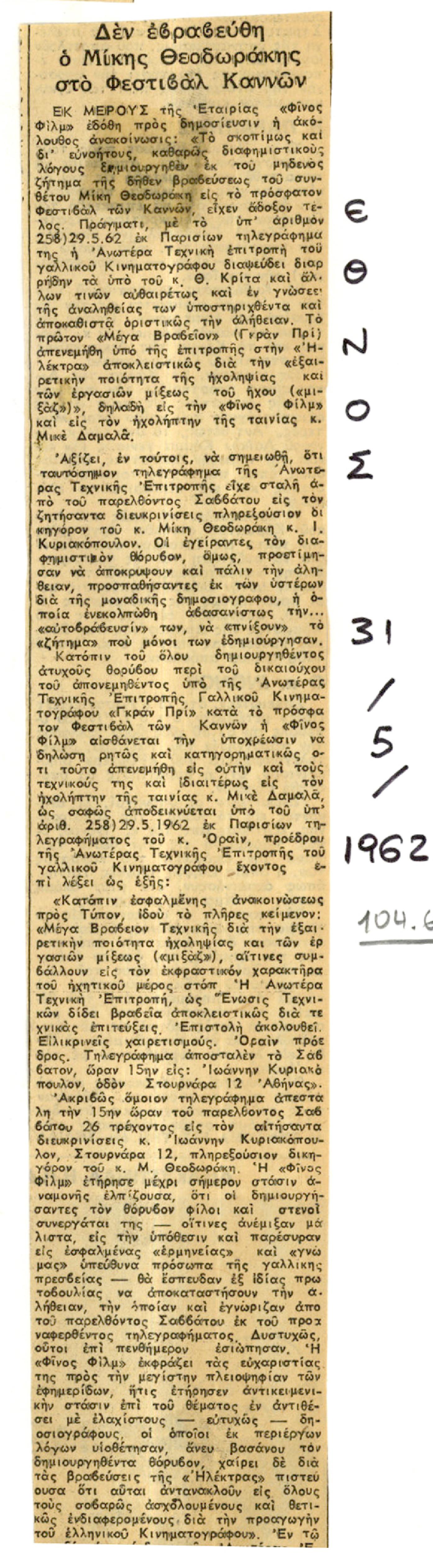 Δεν εβραβεύθη ο Μίκης Θεοδωράκης στο Φεστιβάλ Καννών