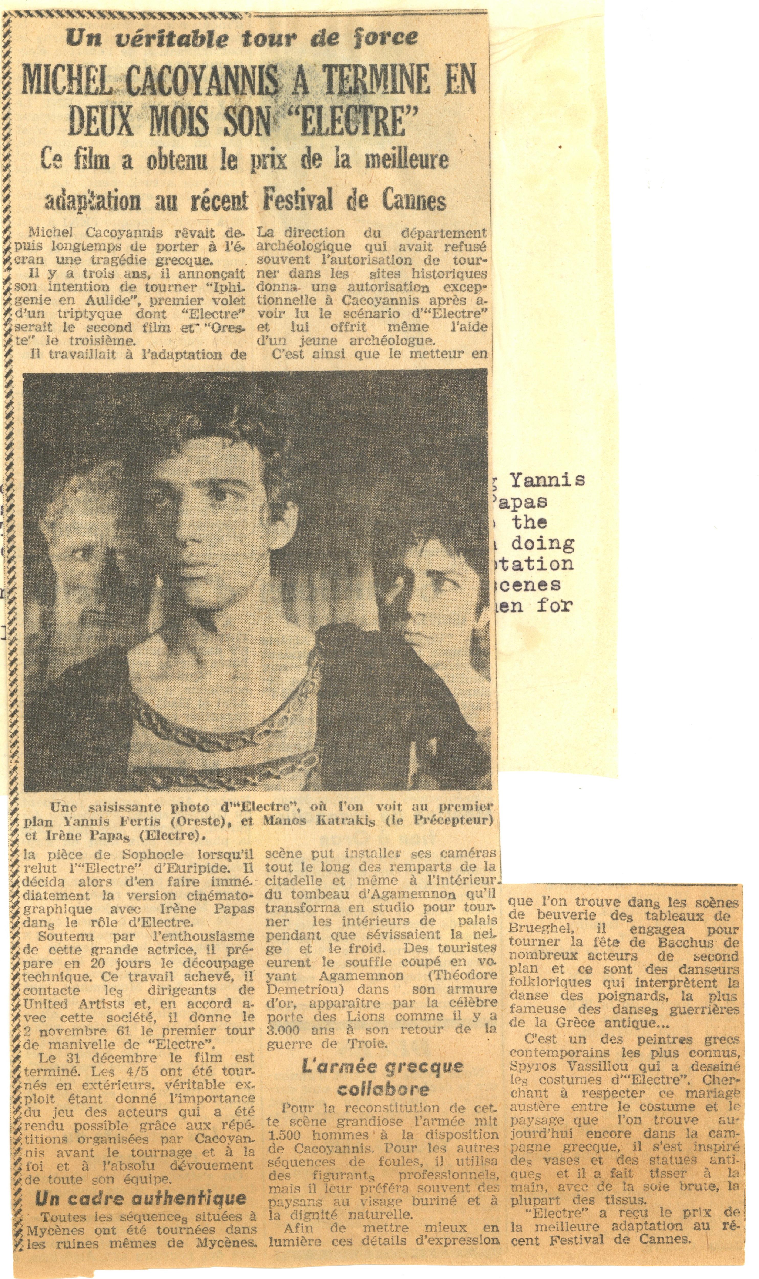 Un véritable tour de force, Michel Cacoyannis a termine en deux mois son Electre