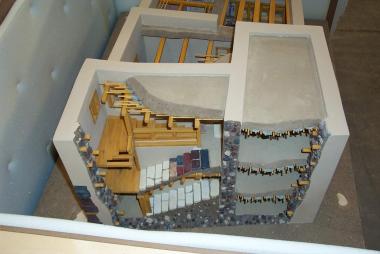 Στο Ακρωτήρι της Θήρας ανασκάπτεται μια εντυπωσιακά διατηρημένη πόλη της Ύστερης Εποχής του Χαλκού (16ος αιώνας π.Χ.). Χάρη στις στάχτες του ηφαιστείου που κάλυψαν τα ερείπια του οικισμού, σώθηκαν σχεδόν ανέπαφα διώροφα και τριώροφα κτήρια. Στο ομοίωμα της λεγόμενης Δυτικής Οικίας - ενός τυπικού σπιτιού της πλούσιας αυτής πόλης - διακρίνονται πολλές από τις οικοδομικές τεχνικές της εποχής εκείνης: ο τρόπος κατασκευής του πατώματος και του κλιμακοστασίου, τα περίτεχνα ξύλινα πλαίσια των ανοιγμάτων που λειτουργούσαν ως φέροντα στοιχεία της οικοδομής, οι λαξευτοί γωνιόλιθοι και τα λαξευτά πλαίσια των παραθύρων με τα έντονα χρώματα των ηφαιστειακών λίθων. Ορισμένα δωμάτια του άνω ορόφου έφεραν τοιχογραφίες (μία εξ αυτών εικονίζει στόλο). Στον όροφο βρέθηκε επίσης εγκατάσταση υγιεινής.