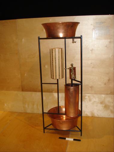 Ανάμεσα στις εφευρέσεις του Κτησίβιου ο Βιτρούβιος (9, VIII) αναφέρει και το υδραυλικό ρολόι. Πρόκειται για το πρώτο ρολόι που, σε αντίθεση με το ηλιακό, μπορούσε να χρησιμοποιείται και τη νύχτα και για το λόγο αυτό ονομάζεται και horologium hibernum, δηλαδή ωρολόγιον νυχτερινόν. Το υδραυλικό ρολόι αποτελεί μια πολύ βελτιωμένη έκδοση της κλεψύδρας. Αποτελείται από ένα συνδυασμό τριών δοχείων τα οποία είναι εφοδιασμένα με ρυθμιζόμενους ελεγκτές ροής. Το ανώτερο δοχείο περιέχει το νερό που χύνεται στο μεσαίο δοχείο, την κλεψύδρα. Από κει το νερό χύνεται στο κατώτερο δοχείο που περιέχει τον πλωτήρα. Ο πλωτήρας ανυψώνεται ανάλογα με το ύψος του νερού και, καθώς ανεβαίνει ένα αγαλματίδιο δείχνει την ώρα πάνω σε κάθετη κλίμακα που είναι χωρισμένη σε δώδεκα μέρη, όσες και οι ώρες από την ανατολή μέχρι τη δύση του ήλιου για την ημέρα και από τη δύση μέχρι την ανατολή για τη νύχτα. Πιθανότατα οι αλλαγές που επιβάλλονταν να γίνουν λόγω της διαφορετικής διάρκειας της μέρας και της νύχτας ανάλογα με την εποχή επιτυγχάνονταn είτε με την αλλαγή στην ταχύτητα ροής του νερού είτε με την αλλαγή των δώδεκα υποδιαιρέσεων στην κλίμακα. ΑΕΤ 2009 Το υδραυλικό ρολόι του Κτησιβίου (3ος αιώνας π.Χ.) αποτελείται από συνδυασμό δοχείων εφοδιασμένων με ρυθμιζόμενους ελεγκτές ροής του νερού έτσι ώστε να επιτυγχάνεται η επιθυμητή ανύψωση του πλωτήρα στο τελευταίο δοχείο. Ο πλωτήρας φέρει δείκτη, ο οποίος υποδεικνύει την ακριβή ώρα πάνω σε περιστρεφόμενο τύμπανο. Το τύμπανο αλλάζει θέση ανάλογα με την ημερομηνία ώστε να εξασφαλίζεται η ακριβής διαίρεση των δώδεκα ημερήσιων ωρών που μετρούσαν την εποχή εκείνη. Το ρολόι λειτουργούσε με χειριστή ο οποίος μία φορά την ημέρα το τροφοδοτούσε με νερό και τοποθετούσε το τύμπανο με τις ώρες στη σωστή ημερομηνία Από το δελτίο εκθέματος: "ο Κτησίβιος (308-246 π.Χ.) ήταν ο πρώτος από τη σχολή μηχανικών της Αλεξάνδρειας που κατασκεύασε υδραυλικό ωρολόγιο ως μετεξέλιξη των αρχαιότερων υδραυλικών ωρολογιών τύπου κλεψύδρας. Περιγραφή του ωρολογίου αυτού βρίσκεται στο έργο του Βιτρουβίου "Περί Αρχιτεκτονικής" κεφ 9, 8, 5-7: νερό ρέει με σταθερή ροή από ακροφύσιο μέσα σε μεγάλο δοχείο και ανυψώνει πλωτήρα στον οποίο είναι προσαρμοσμένος κανόνας και πάνω σε αυτόν αγαλματίδιο που λειτουργεί ως δείκτης και δείχνει τις ώρες πάνω σε κατακόρυφο τύμπανο με χαράξεις κάθετες για τους μήνες και εγκάρσιες, όχι όμως παράλληλες για τις ώρες, έτσι ώστε να συνυπολογίζεται η μεταβολή της διάρκειας των ωρών ανά μήνα.