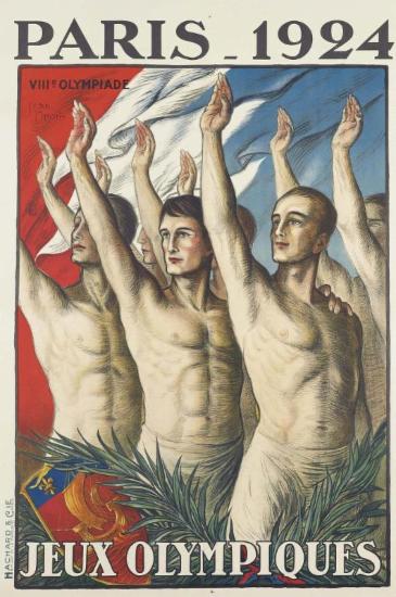 Στους Ολυμπιακούς Αγώνες στο Παρίσι το 1924 η αφίσα δείχνει ημίγυμνους αθλητές, μια ακόμη υπενθύμιση της αρχαιότητας, να χαιρετούν. Στο φόντο δεσπόζει η γαλλική σημαία, στο μπροστινό επίπεδο υπάρχουν δάφνινα κλαδιά, σύμβολα της νίκης. (EL)