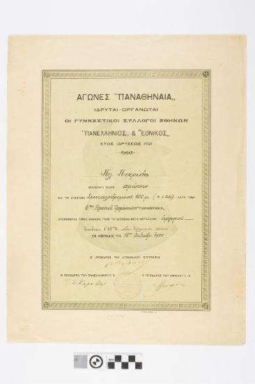 Το δίπλωμα απονεμήθηκε από τους διοργανωτές γυμναστικούς συλλόγους Αθηνών "Πανελλήνιος" και "Εθνικός" στον Πετρίδη Πλ. για την κατάκτηση της πρώτης θέσης στο ομαδικό αγώνισμα της σκυταλοδρομίας 800μ. (4Χ400μ.) κατά τη διάρκεια της 6ης αγωνιστικής οργάνωσης "Παναθήναια" το 1925.