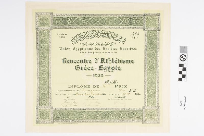 Το δίπλωμα απονεμήθηκε από την Union Egyptienne des Societes Sportives στον αθλητή Φραγκούδη για την κατάκτηση της 2ης θέσης στο άθλημα του στίβου κατά τη διάρκεια αθλητικών αγώνων μεταξύ Ελλάδα και Αίγυπτο