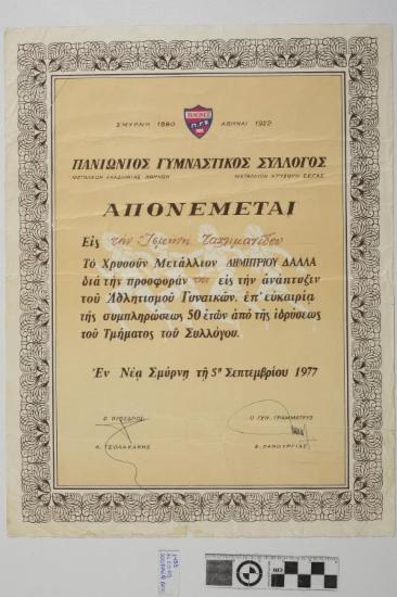Το δίπλωμα απονεμήθηκε από το Σύνδεσμο Ελληνικών Αθλητικών και Γυμναστικών Σωματείων στην αθλήτρια Λανίτου Δομνίτσα για την κατάκτηση της 1ης θέσης στο αγώνισμα του δρόμου 80μ. με εμπόδια, κατά τους Πανελλήνιους Αγώνες το 1935