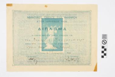 Το δίπλωμα τιμής ένεκεν απονεμήθηκε από τον Αθλητικό Όμιλο Παλαιού Φαλήρου στον αθλητή Μαυραπόστολο Βασίλειο για την κατάκτηση της πρώτης θέσης στο αγώνισμα του δρόμου 800μ. το 1936.