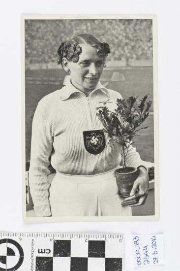 Φωτογραφία με μια αθλήτρια βραβευμένη. Στην οπίσθια όψη υπάρχει ο τίτλος: Tilly Fleischer, die Siegerin im Speerwerfen, bei der Siegerehrung.
