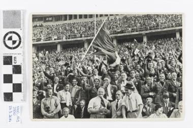 Φωτογραφία από τις κερκίδες του σταδίου. Στην οπίσθια όψη υπάρχει ο τίτλος: Die "italienische Ecke" im Olympiastadion verfolgte begeistert den Kampf der Olympiasieger gegen Osterreich, Fahnen wurden geschwenkt, und jeden Vorstoss der Italiener begleiteten Anfeuerungsrufe.