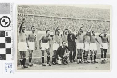 Φωτογραφία με ομάδα ποδοσφαίρου. Στην οπίσθια όψη υπάρχει ο τίτλος: Italiens Olympiasieg im Fussball - Turnier wurde von einer jungen Studentenmannschaft errungen, die im Endspiel Osterreich mit 2:1 schlug.