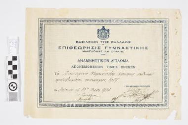Το δίπλωμα τιμής ένεκεν απονεμήθηκε από την Επιθεώρηση Γυμναστικής Μακεδονίας και Θράκης στην αθλήτρια Μαρωνιτίδου Αικατερίνη για τη νίκη της στο Σχολικό Πρωτάθλημα Πετοσφαίρισης το 1937.