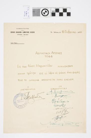 Το δίπλωμα απονεμήθηκε στην αθλήτρια Μαρωνιτίδου Αικατερίνη που κατέκτησε την 3η θέση στο αγώνισμα του άλματος εις μήκος άνευ φόρας, στους αθλητικούς αγώνες που διεξήχθησαν στην Αθήνα το 1944 (EL)