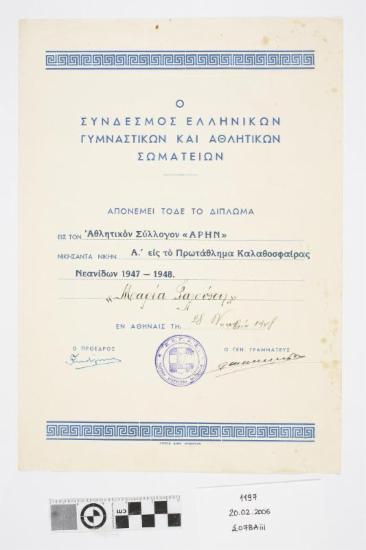 Το δίπλωμα απονεμήθηκε από το σύνδεσμο Ελληνικών Γυμναστικών και Αθλητικών Σωματείων στην αθλήτρια Γαλούπη Μαρία του Αθλητικού Συλλόγου "ΑΡΗ" για την κατάκτηση της 1ης θέσης στο Πρωτάθλημα Καλαθοσφαίρισης Νεανίδων 1947 - 1948