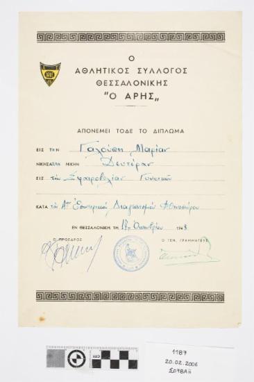 Το δίπλωμα απονεμήθηκε από τον Αθλητικό Σύλλογο Θεσσαλονίκης "Ο ΑΡΗΣ" στην αθλήτρια Γαλούπη Μαρία για την κατάκτηση της 2ης θέσης στο αγώνισμα της σφαιροβολίας γυναικών στον 1ο Εσωτερικό Διαγωνισμό Φθινοπώρου το 1948
